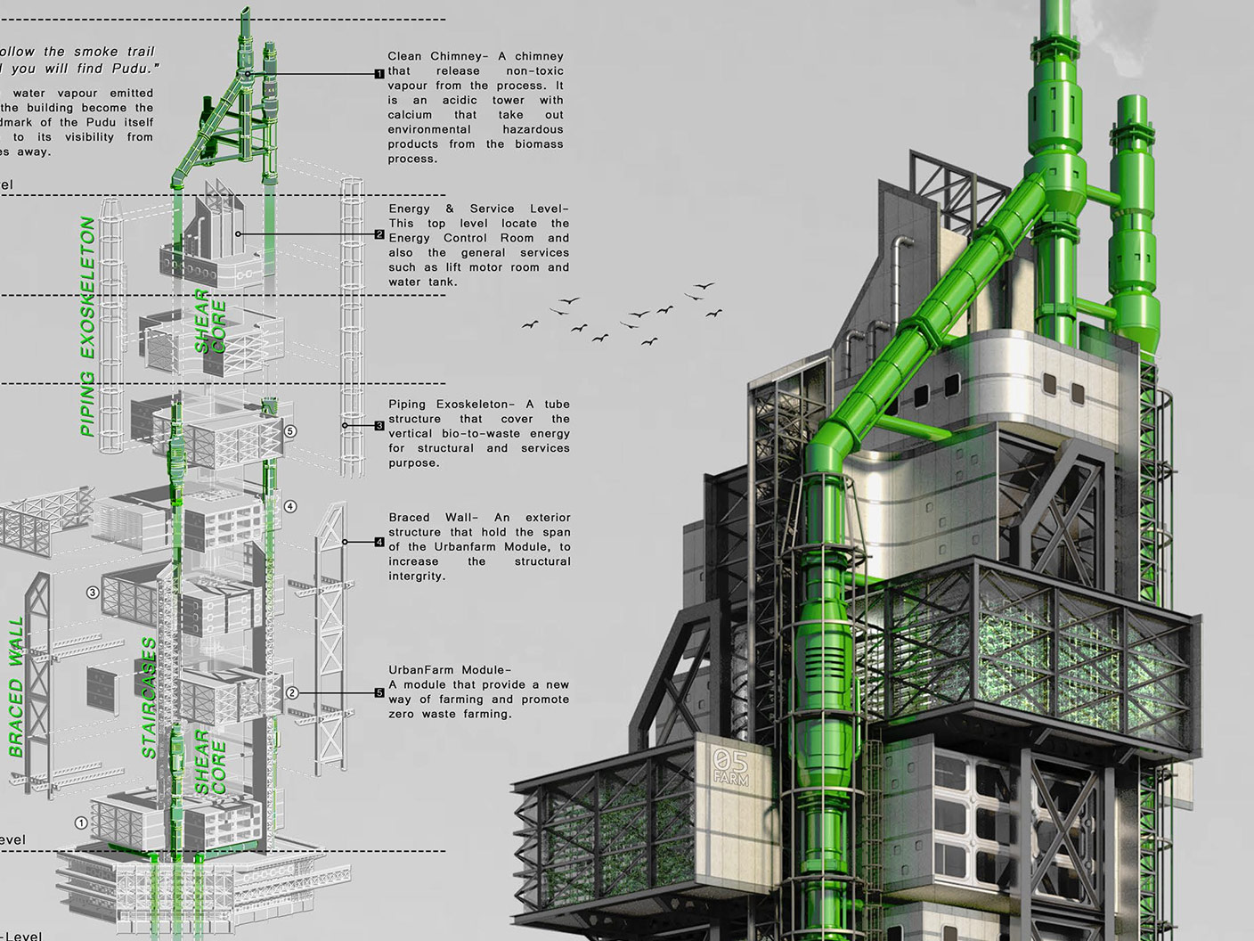 Rapid urbanization and excessive population growth have caused the fragmentation of the greenery in most of the cities around the world. People are living in a “concrete jungle” environment, under high pressure. The design concept of The Seed is intended to build a home for all humankind, flora and fauna, to celebrates the nature to which humans originally belong. The proposed tower is located in one of the city’s most prime zones, serving as a “green catalyst” to attract local urban dwellers and tourists, leading to a substantial improvement in the living quality of the place. The Seed consists of modular containers intersecting between different themed farming platforms, the concept of which is inspired by the transverse plane of the plant that secures the harmonious coexistence between humankind and nature.