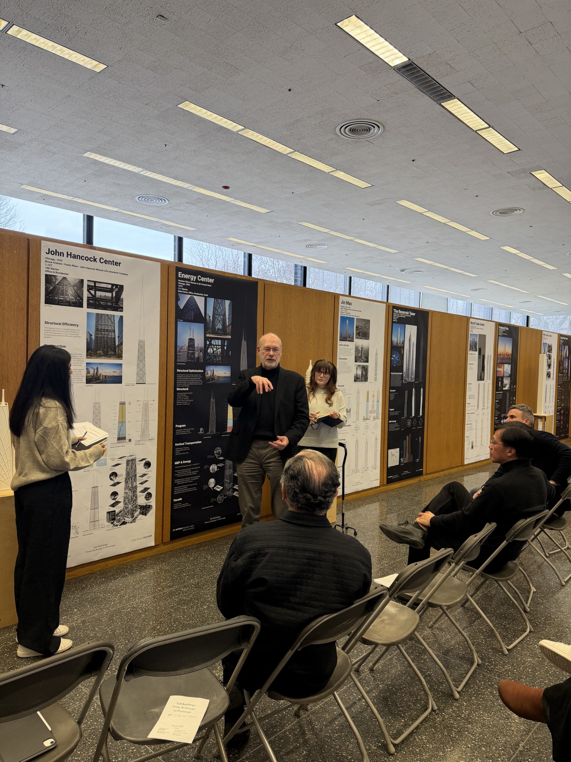 The semester also featured the Tall Technologies I Lecture Series and Talking Tall II, both organized by Antony Wood and Kristin LaSorsa, which brought leading professionals into the classroom to share insights from their projects and careers. Talking Tall I, primarily led by Antony Wood with several guest lecturers throughout the semester, focuses on the principles of tall buildings, helping students understand their history, development, and future. One highlight of the course was a walking tour of historic skyscrapers in downtown Chicago, where students visited a curated selection of notable buildings from different time periods, offering a firsthand look at the architectural and structural evolution of the Chicago skyline.