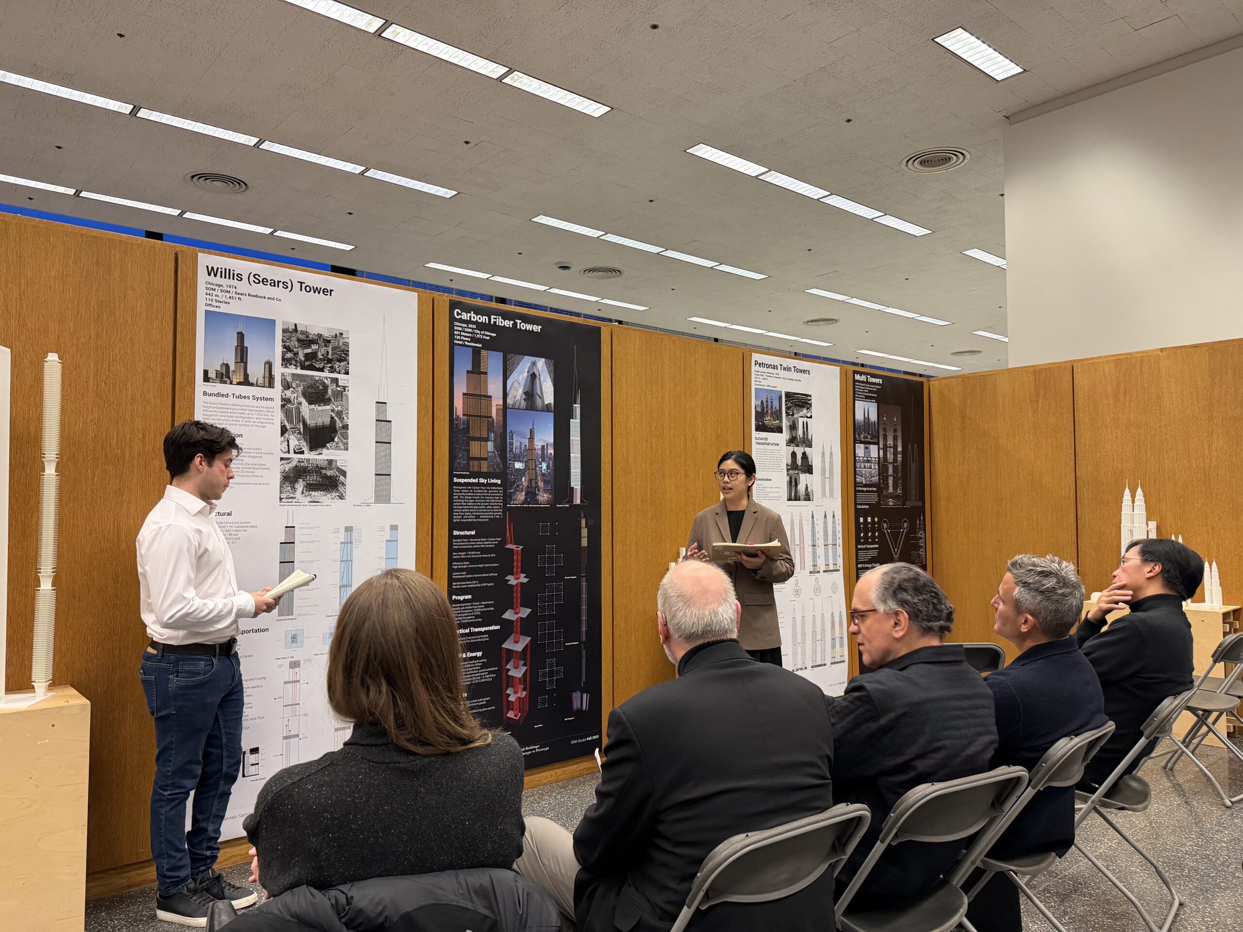The final review jury included Luke Leung, PE, Principal at SOM; Jenna Dezinski, Associate at BIG; Reed Kroloff, Dean of the IIT College of Architecture. Joined by SOM studio faculty Scott Duncan, AIA, LEED AP, Partner at SOM; Jason Fisher, AIA, Studio Head at SOM; and Jorge Rovira, AIA, Studio Head at SOM, William Baker, PE, SE Consulting Partner, SOM