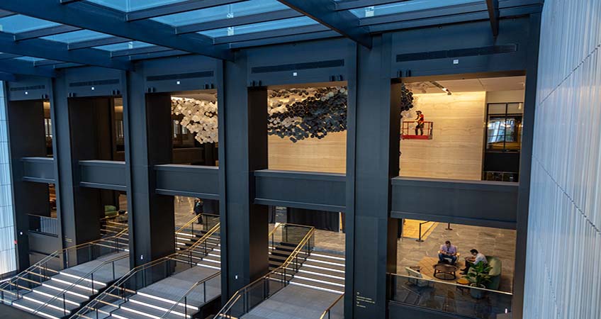 EQ Office, the US office portfolio company owned by Blackstone, has reopened Willis Tower’s Wacker Drive lobby, featuring a new, one-of-a-kind art installation created by artist Jacob Hashimoto.